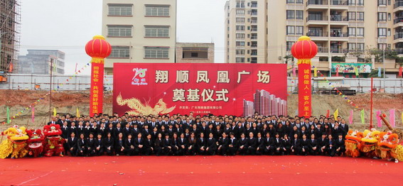10時許,在醒獅點睛的熱烈氣氛烘托下,集團領導崔健全、鐘世雄、潘錦基、鄺紹榮等共同為鳳凰廣場項目奠基培土,宣告翔順首個商業地產項目正式啟動。