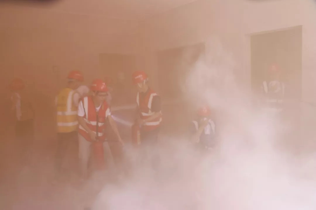 演練小組動力組迅速到現場切斷電源,各組員按照指揮部署,引導現場工人按照應急通道緊張有序地離開現場,禁止工人進入電梯或亂跑動,并向工人提供濕毛巾捂嘴。