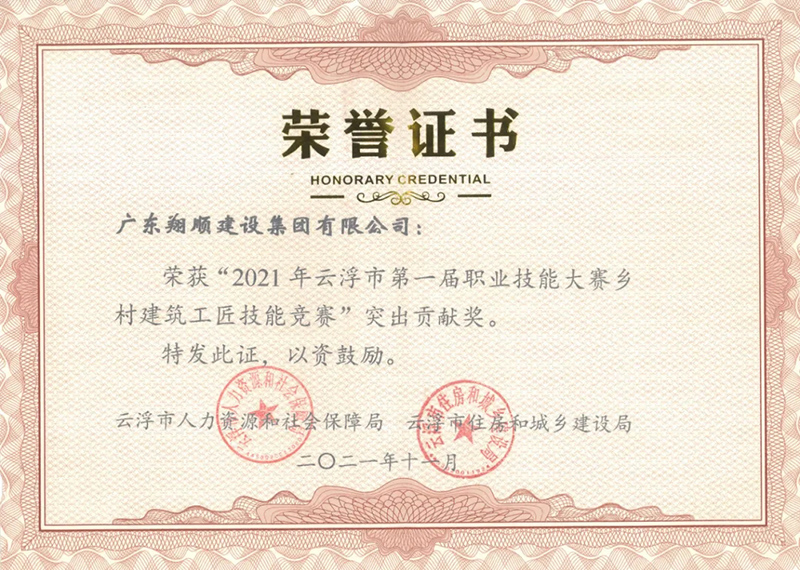翔順建設集團作為本次競賽協辦單位之一榮獲“2021年云浮市第一屆職業技能大賽鄉村建筑工匠技能競賽”突出貢獻獎,并且被云浮第一屆職業技能大賽組委會授予“云浮技能人才工程金牌培育單位”。