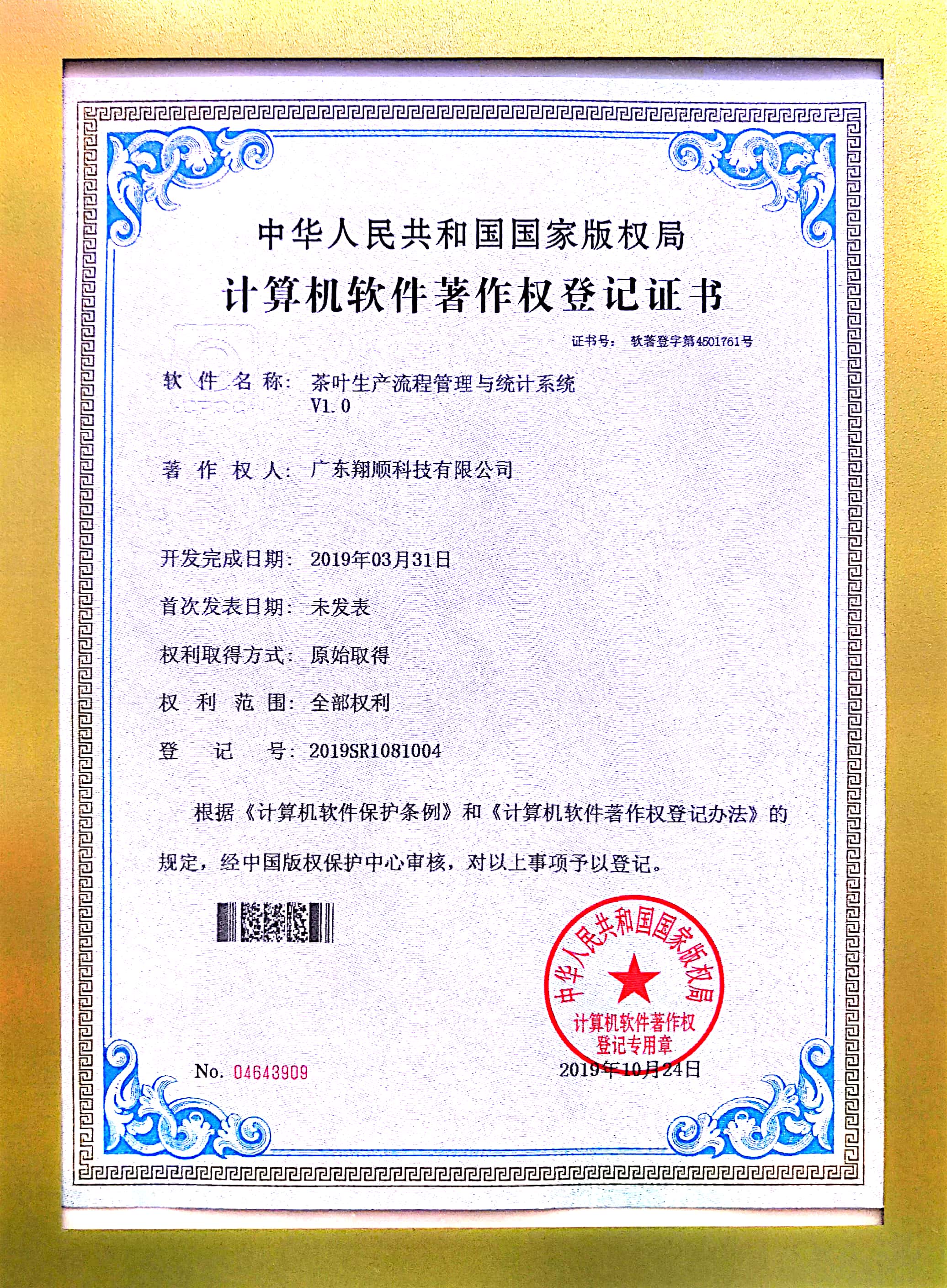 茶葉生產流程管理與統計系統計算機然間登記證書