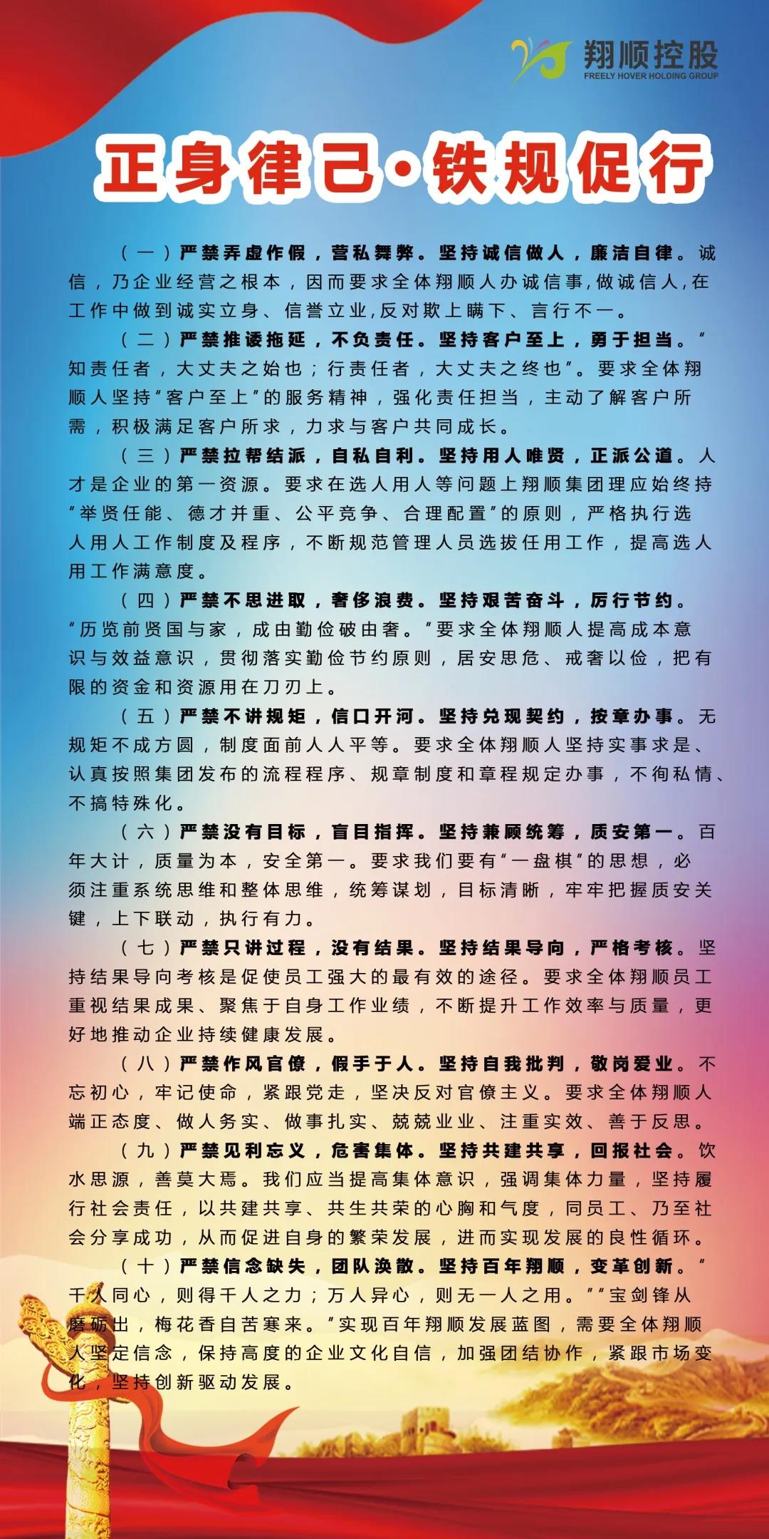 為積極響應翔順集團號召,翔順文旅板塊在4月開展以“正身律己·鐵規促行”為主題的翔順十大鐵規宣傳學習月活動。