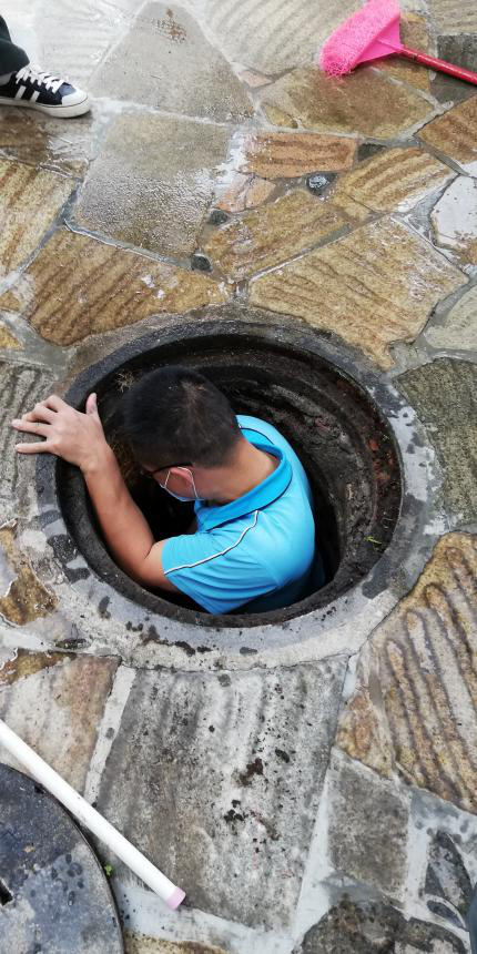 2020年2月24日,溫泉池區有一條排水溝堵塞,剛好工程部崔部長經過,了解情況后,他二話不說,馬上打開排污井蓋爬到里面檢查。經檢查,原來是樹根堵塞污水管,他便徒手把外面的樹根處理了,擔心還有樹根已經深入到水管內部,還找來工具把水管內的樹根清理出來