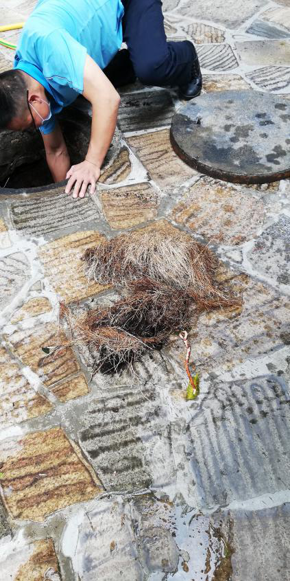 一番基礎清理后,污水管還是不能正常排水,他又叫來工程部其他同事,并帶來專通排水管的工具,在大家的努力下終于把排水管疏通了。