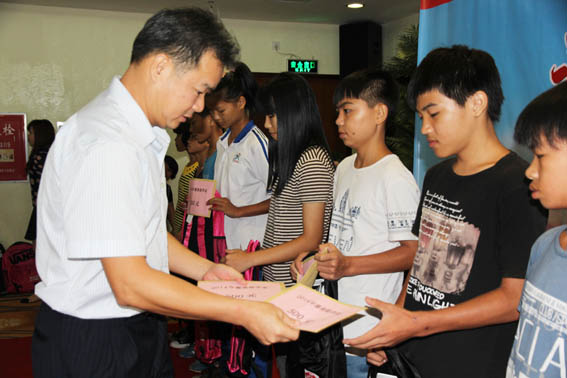儀式上,區(qū)耀啟、梁國華、陳啟雄、龍飛波、崔健全、鐘世雄向60名貧困學生代表贈送了學習用品和助學金。