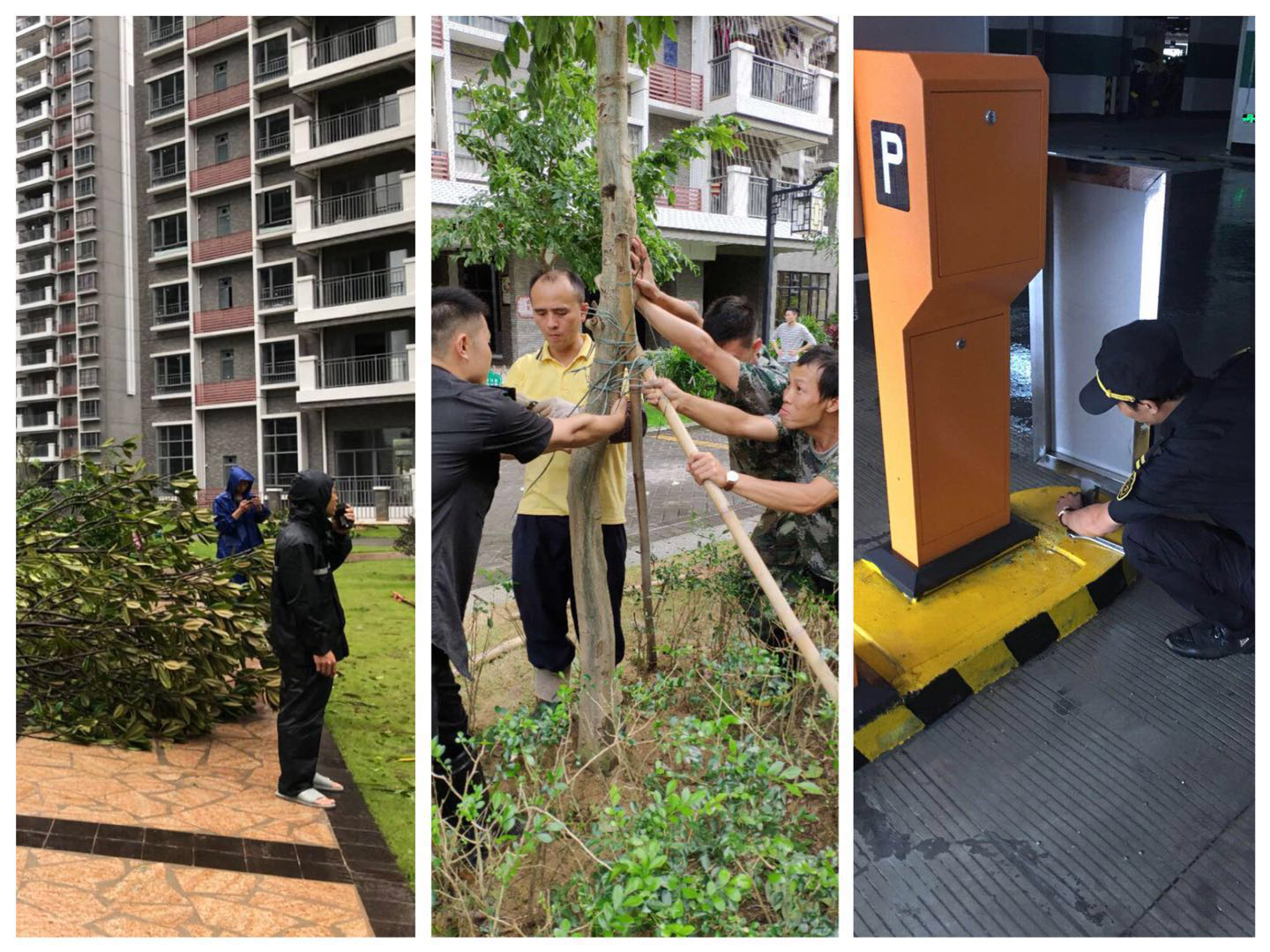 擔當起筠州花園設備安全運行,抗擊“山竹”任務的責任,從臺風前的區內公共設備運行安全排查,到臺風來襲時風里來雨里去的小區設備安全巡查,以及業主窗戶被吹反的及時維護,三人均能馬上作出反應,及時趕到現場為業主排憂解難。