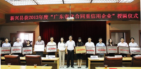 10月15日,新興縣獲2013年“廣東省守合同重信用”的授牌儀式在縣工商局七樓會(huì)議室舉行。縣46家企業(yè)接受表彰,翔順集團(tuán)及十家下屬公司獲得該稱號(hào)(下圖為翔順十一家公司合影),其中翔順集團(tuán)連續(xù)13年被授予該稱號(hào)。