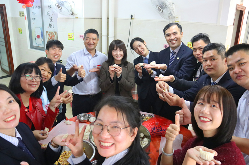 翔順物業公司總經理黃立志、翔順物業副總經理蘇國英等一眾領導細心詢問了員工的工作及生活情況,向在崗的員工及他們的家人致以新年的問候,并和員工興致勃勃地一起制作云浮特色年味小食——“蠶蛆”、包餃子。領導的親切問候和誠摯祝福,讓留值員工倍感溫暖和關懷。