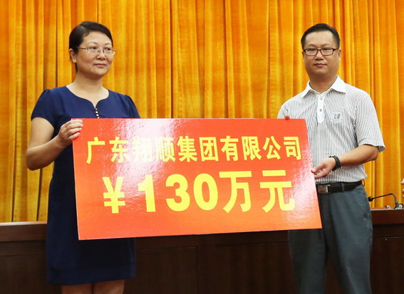 2015年6月30日,在第六個廣東省“扶貧濟困日”新興縣捐款活動現(xiàn)場,集團副總裁鐘世雄(右)代表集團捐資130萬元。