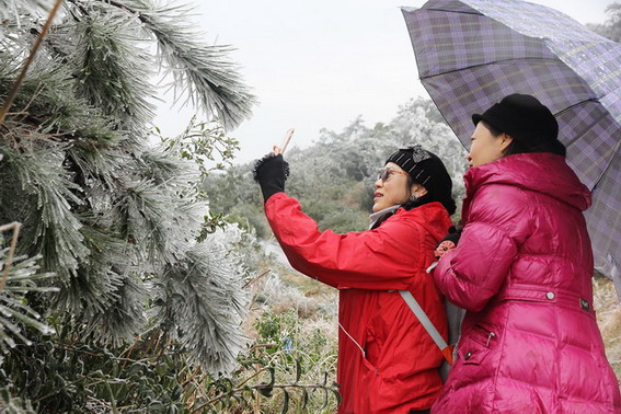 當(dāng)天,象窩山上降雪最大,特別是飛天蠶頂峰,隨處可見皚皚雪景,積雪、霧凇等讓人驚嘆不已。