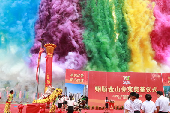 當天上午,云浮市環(huán)市中路188號云浮新世紀廣場旁地塊鑼鼓喧天、醒獅舞動,金山豪苑項目奠基議程逐項進行。首先云浮市新世紀廣場物業(yè)管理有限公司董事長張文先生和集團總裁助理鄺紹榮進行了項目交接;緊接著,集團總裁崔健平,集團副總裁崔健全、鐘世雄,房地產(chǎn)公司總經(jīng)理耿志新、副總經(jīng)理蔡韶銘等6位領(lǐng)導分別為6頭醒獅點睛和掛紅,集團總裁崔健平、總裁助理鄺紹榮進行“接財”;隨后崔健平、崔健全、鐘世雄、潘錦基、崔健鋒、鄺紹榮、崔仲昌、耿志新、陳彬、蔡韶銘、勞志鴻等集團領(lǐng)導以及王維敬、張文等嘉賓領(lǐng)導一同為項目培土,奠基儀式各項議程緊湊有序、莊嚴隆重。隨著皇家禮炮和七彩禮炮的鳴放騰空、奠基儀式圓滿完成。