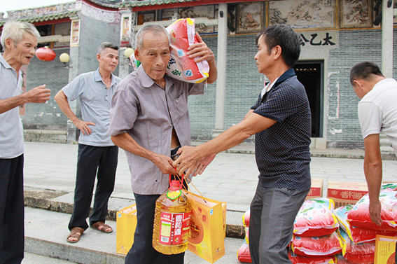 壩塘村宗祠門前,一箱箱花生油、一袋袋大米,還有那包裝精美的翔順月餅一字排開。壩塘村18名五保老人全部領取到了翔順集團的節(jié)日慰問品及慰問金,老人們臉上綻放了笑容。