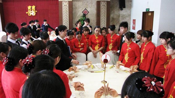為給員工創造一個相互學習的平臺,不斷提高員工的自身素質,11月14日下午,實操技能比賽在酒店二樓金百合廳舉行,50多名員工觀看了比賽。比賽分為6批次進行,每批4人,每人要完成十余種物品的擺放,由樓面部四位領導擔任裁判進行觀測點評并評分。評分依照參賽者的擺臺姿勢、順序、物品之間的距離和角度、席巾花的折疊與放置等以及所用時長為主要內容。