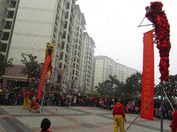 2月5日上午和下午,由舊郎醒獅隊總教練梁志沖帶領著獅子隊先后來到翔順花園二區、三區進行醒獅表演。配以象征獅吼和風雷之聲的大鼓、厚鑼、響鈸,以鼓聲的強弱、快慢、急速與柔和,獅子隨之起舞,時而左右盼顧,時而引頸獨立,俯仰跳躍,表演“獅子出洞”、“窺測方向”、“高臺飲水”、“歡天喜地”、“過天橋”、“跨三山”等動作,搖頭擺尾,喜怒哀樂,感情色彩豐富。一番表演之后,觀眾們把注意力投向了大頭佛身上。只見大頭佛不斷以手中的“青”(代表靈芝草)逗引獅子,獅子搶奪到手后吃下,不久便醉倒在地,稱為“醉青”。這時,大頭佛得意地在獅子身上做些滑稽的小動作逗引觀眾發笑。頓時獅子醒來,昂首跳躍,踩著五彩云路走下凡塵。隨著樂聲起伏,把“獅子”從酣睡到奮起的神態舉止、喜怒哀樂表現得淋漓盡致。最令人矚目的算是“高樁爭霸”了,令人觸目驚心。吸引了小區業主前來觀看,現場掌聲、喝彩聲連綿不斷,小區充滿了濃濃的喜慶氣氛。