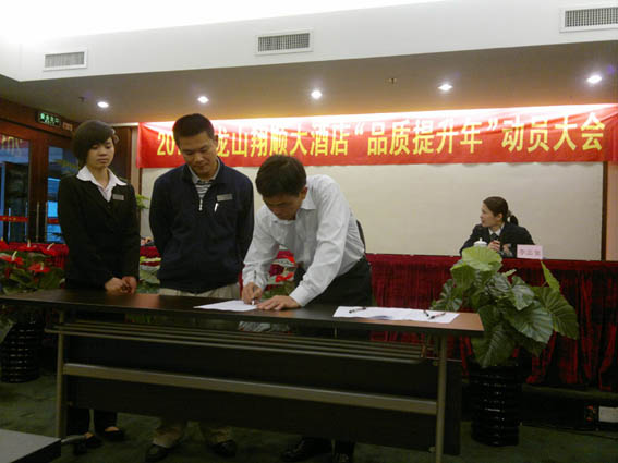 本次會議除值班人員外,其他員工全部參加。會上,酒店總經理從市場競爭態勢、客戶需求變化、星級標準要求等方面詳細分析了品質“雙提升”對我酒店生存和發展的重要性,并以酒店的各項具體工作為例詳細解釋了“品質”的內涵,明確了在品質提升年要“提升什么”、“怎么提升”,并且對如何切實實現人員素質和服務素質“雙提升”提出了具體的工作要求。會上宣讀了《品質提升年承諾書》,各部門副部長以上人員到臺上現場簽署承諾書,會后各員工也在所屬部門的承諾書上簽字。