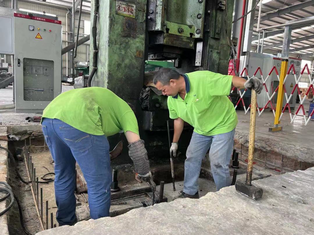 筆者在現場看到,工程中心的老員工禮叔正在和同事加緊處理400噸壓力機的底座,他們身上滿是油污,但絲毫不影響工作,他們麻利地進行著焊接,然后給一個個接近小臂粗壯的螺絲進行加固。要盡快完成生產線后續機器設備的調試安裝才行,避免影響后面的進度。禮叔雖然年紀偏大,但是工作十分積極和賣力,他可是公司的老師傅,周六還依然奮戰在一線。